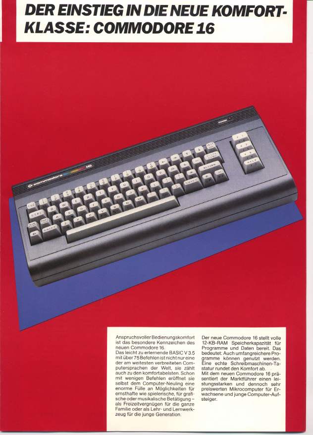 | C16 | 16k memory (12 k available for BASIC, 2k with graphics enabled), case very similar to that of the old C64 ("breadbox"), dark gray color. |