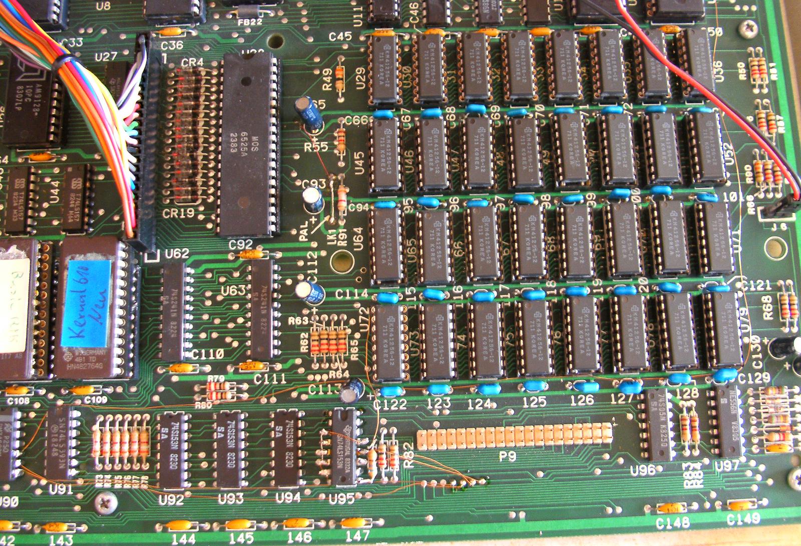 The PAL (a 82S100) has the job to select the 4 existing memory banks by generating the RAS and CAS signals described above. Why they choose this chip is a good question. Either the thing was available on bargain offer (at Völkner?) or PAL was mistaken for "Pay Additional Luxury". The slowest version of a 20 (instead of 28) pin PAL 16L8 accomplishes the same job in 2/3 of the time for 1/3 of the price.